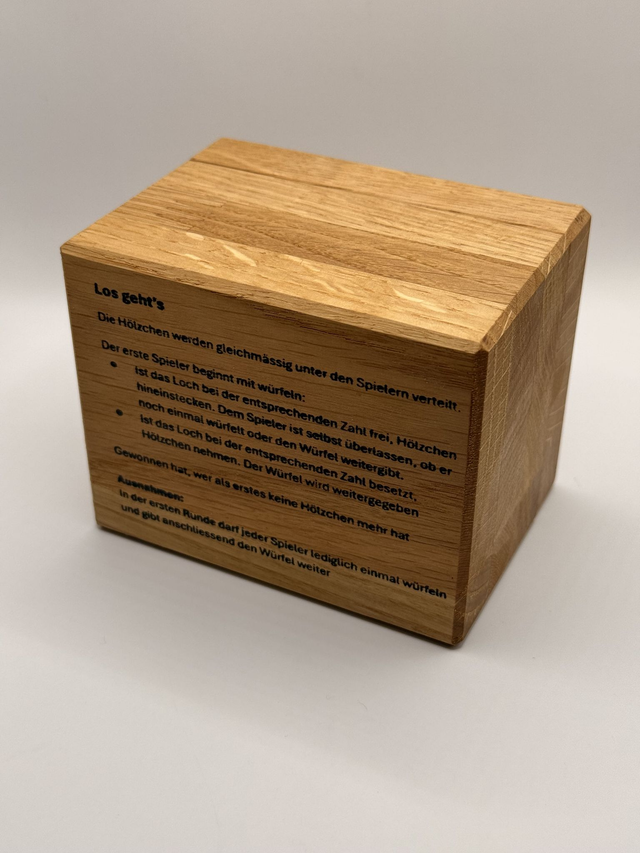 • 1x Holzbox als Spielfeld, mit aufgedruckter Anleitung auf der Unterseite