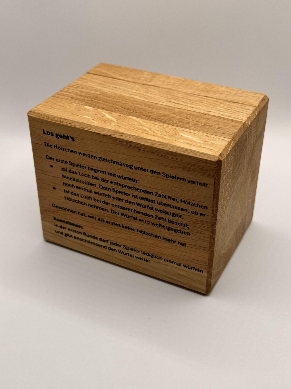 Holz ist ein lebendiges Material, und jedes Spiel ist ein Unikat. Die natürliche Maserung und Struktur verleihen jedem Stück seinen eigenen Charakter. Auch das Logo wird individuell ins Holz gebrannt und macht jedes Exemplar zu etwas Besonderem.